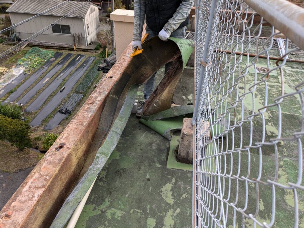 今回は立上り部分のみウレタン防水を行うので、既存防水シートを剥がしていきます!!
