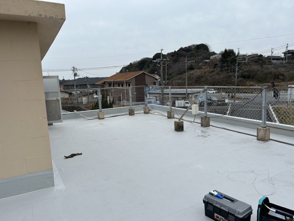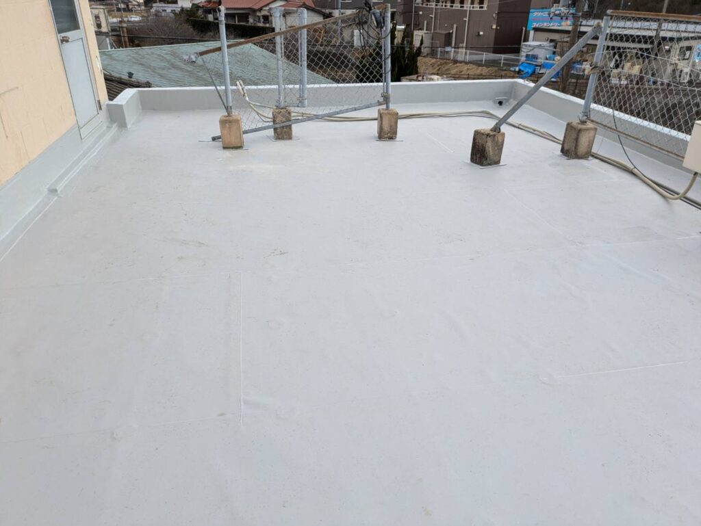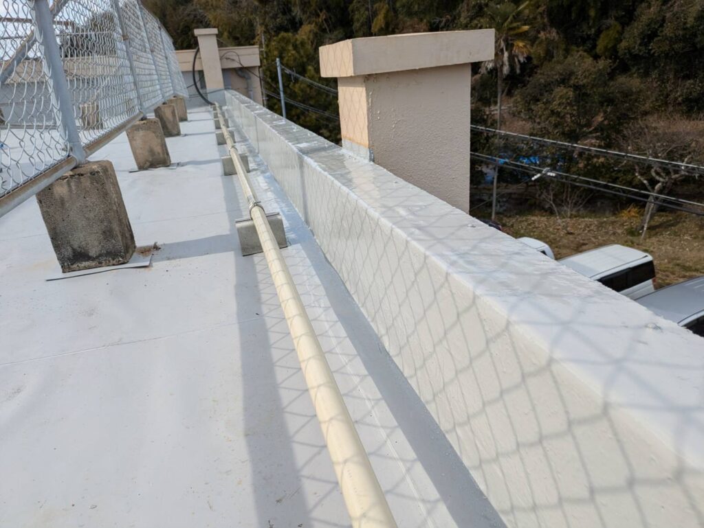 今回はご予算の兼ね合いで、一番雨漏りのリスクがある立上りの部分のみウレタン防水、その他の平場は塩ビシート防水施工しました!