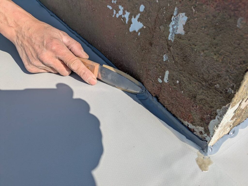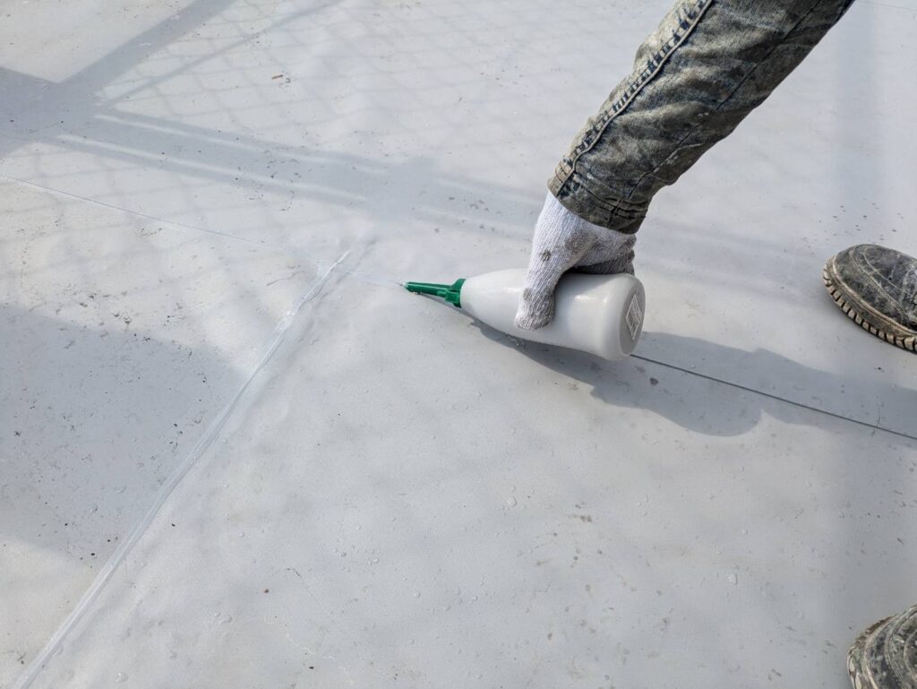 シート接続部も雨水が入り込まないように専用の材料で密着させていきます👷